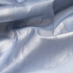 The shawl features a subtle, abstract tulip pattern woven in a pale silvery blue and a sky blue - an understated yet captivating design that plays beautifully with light.