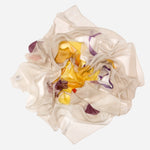 • 100% silk chiffon: A luxurious, gossamer-light fabric known for its sheer, delicate texture and graceful drape. Its natural breathability and gentle movement enhance the beauty of our designs.