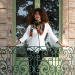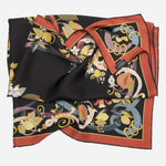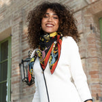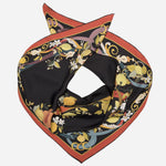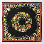 This floral wreath pattern with Mediterranean citrus fruits and pomegranates is a timeless symbol of natural beauty and feminine charm, which is how this scarf will make you feel.