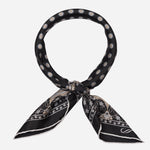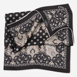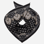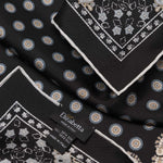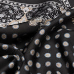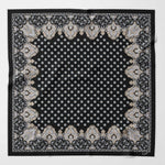 Give your look a touch of Italian style with this large silk neckerchief/bandana scarf. Featuring a timeless small medallion print accented by an intricate Arabesque Pattern border, it effortlessly enhances your attire, inviting compliments wherever you go.