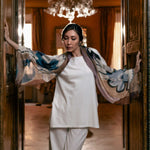 Woven from the softest, finest wool gauze, this oversized scarf floats around you - warm, never heavy. The open weave gives it breath, bounce, and an elegant drape whether worn loose as a shawl or wrapped as a scarf.