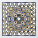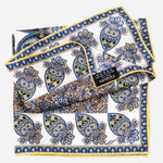 Deep Mediterranean blue with golden yellow, tangerine and clean white—this pocket square has a paisley pattern that is rich, but not fussy.