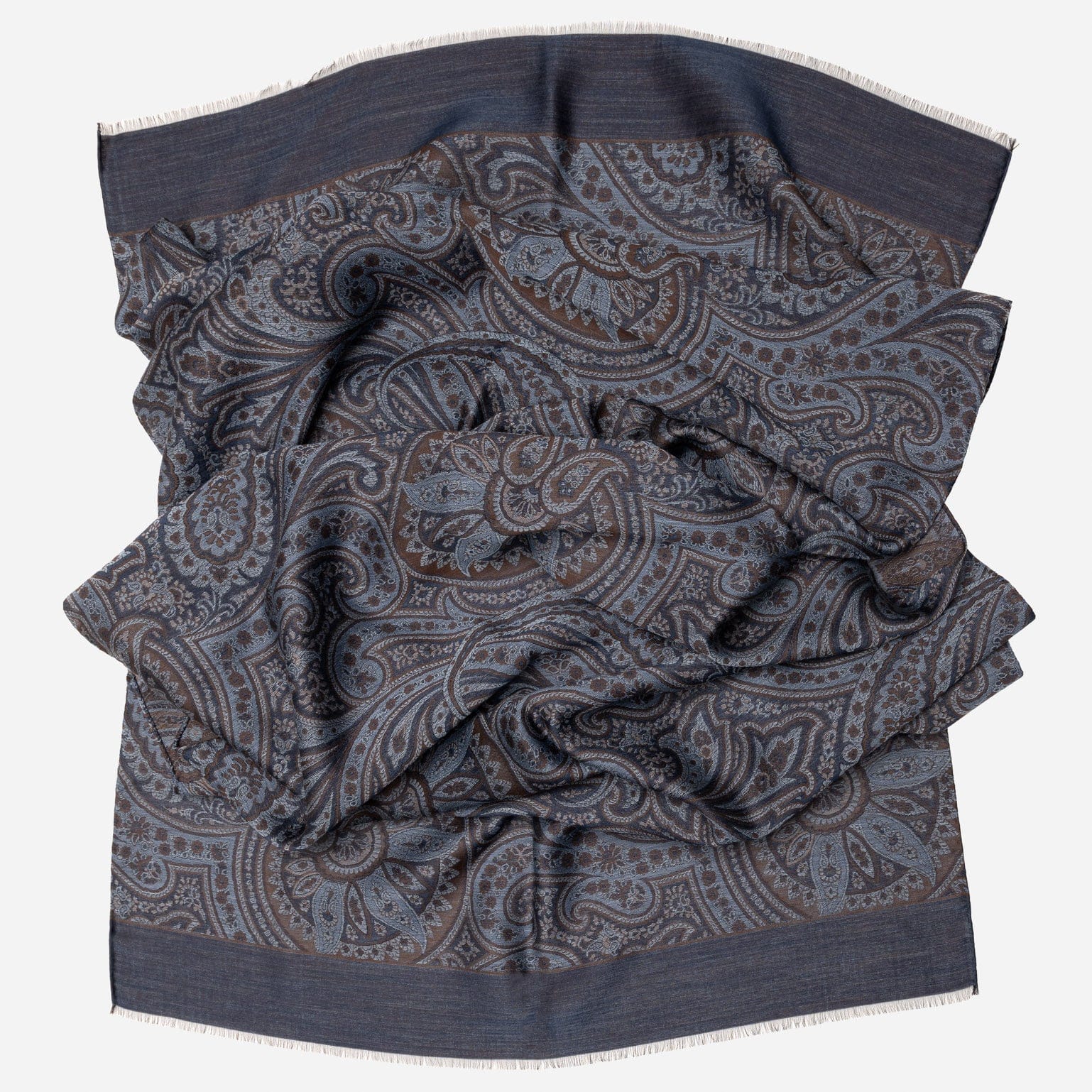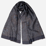 This generously sized scarf—27 x 74"—is woven from a luxurious, breathable blend of wool and silk, offering warmth without bulk. The traditional paisley pattern isn’t printed, but intricately woven on a jacquard loom, giving the fabric a subtle texture and depth that only skilled Italian craftsmanship can create.