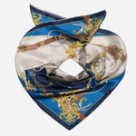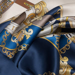 Printed on luxurious silk satin, this scarf features a charming design of pocket watches and jeweled belts, symbolizing the delicate balance of time and style.