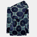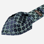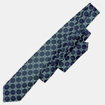 This stunning silk tie boasts an elegant circle motif woven in shades of blue and turquoise, standing out beautifully against the darkest blue background—a shade so deep it shifts between black and navy depending on the light.
