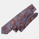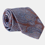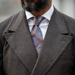 This tie captures that timeless elegance and refinement. Handcrafted in Italy from the finest silk in copper brown, blue and tan hues, it adds a touch of sophistication to any outfit, a testament to your impeccable taste and appreciation for the finer things in life.