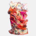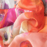 Named after the famous piazza in Rome, Campo de' Fiori (field of flowers), this sheer silk Georgette long scarf has a floral print in shades of coral and pink.