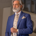 I named this tie after the Medici family, a symbol of power and refinement in Italian history. This beautiful neutral beige tie features a delicate floral print in soft earthy tans and pale blue.