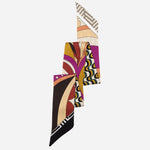 This twilly scarf features elegant geometric patterns in earth tones and pink. It’s double sided which ensures a polished look however you choose to style it.