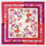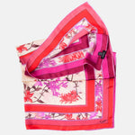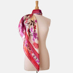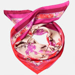 This fuchsia and red square silk satin scarf, with its lovely floral print, adds a vibrant splash of colors. It’s the perfect way to brighten up any outfit and make a stylish statement.
