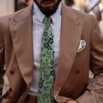 I have a real passion for bringing back vintage patterns because they’re truly one-of-a-kind. This silk tie, with its vintage woven floral design in dark blue and grey tones on spring green, is a perfect example.