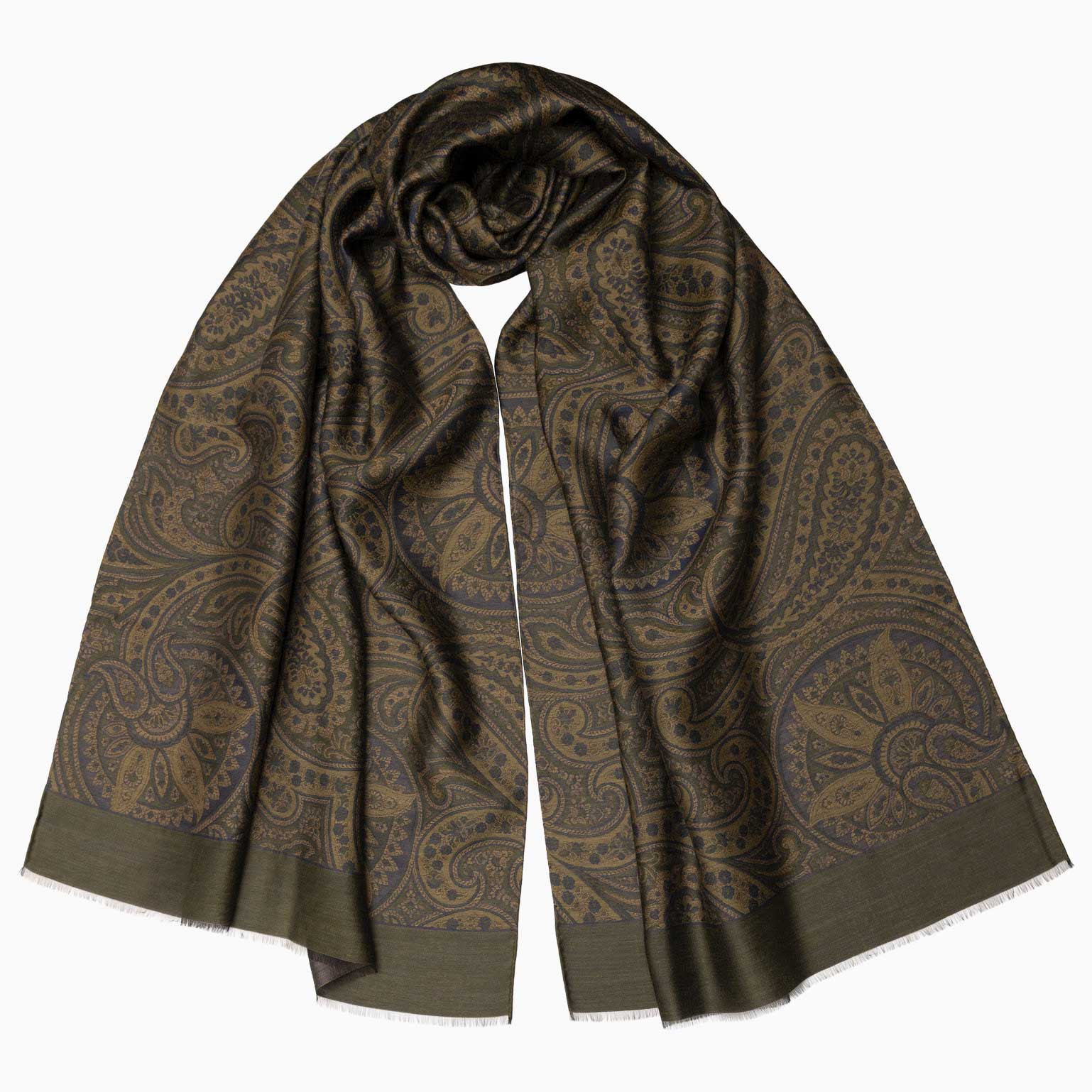 This generously sized scarf—27 x 74"—is woven from a luxurious, breathable blend of wool and silk, offering warmth without bulk. The traditional paisley pattern isn’t printed, but intricately woven on a jacquard loom, giving the fabric a subtle texture and depth that only skilled Italian craftsmanship can create.