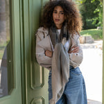 The design features paintbrush strokes in muted shades of greys and tans, making it a versatile piece that works beautifully draped over your shoulders as a shawl or wrapped snugly around your neck.