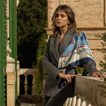 This 35" square scarf is printed on silk twill, giving it a beautiful drape with just enough body to tie neatly and hold its shape.
