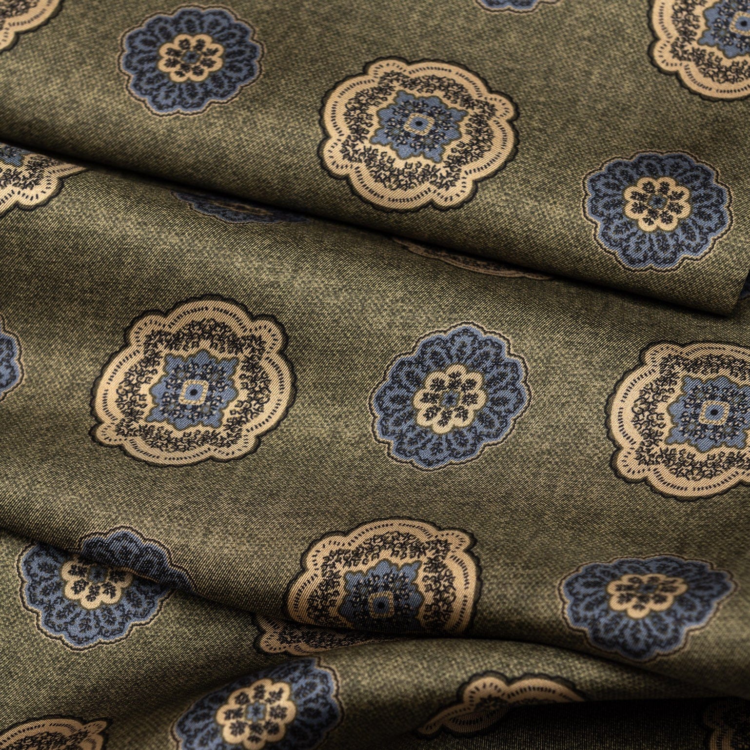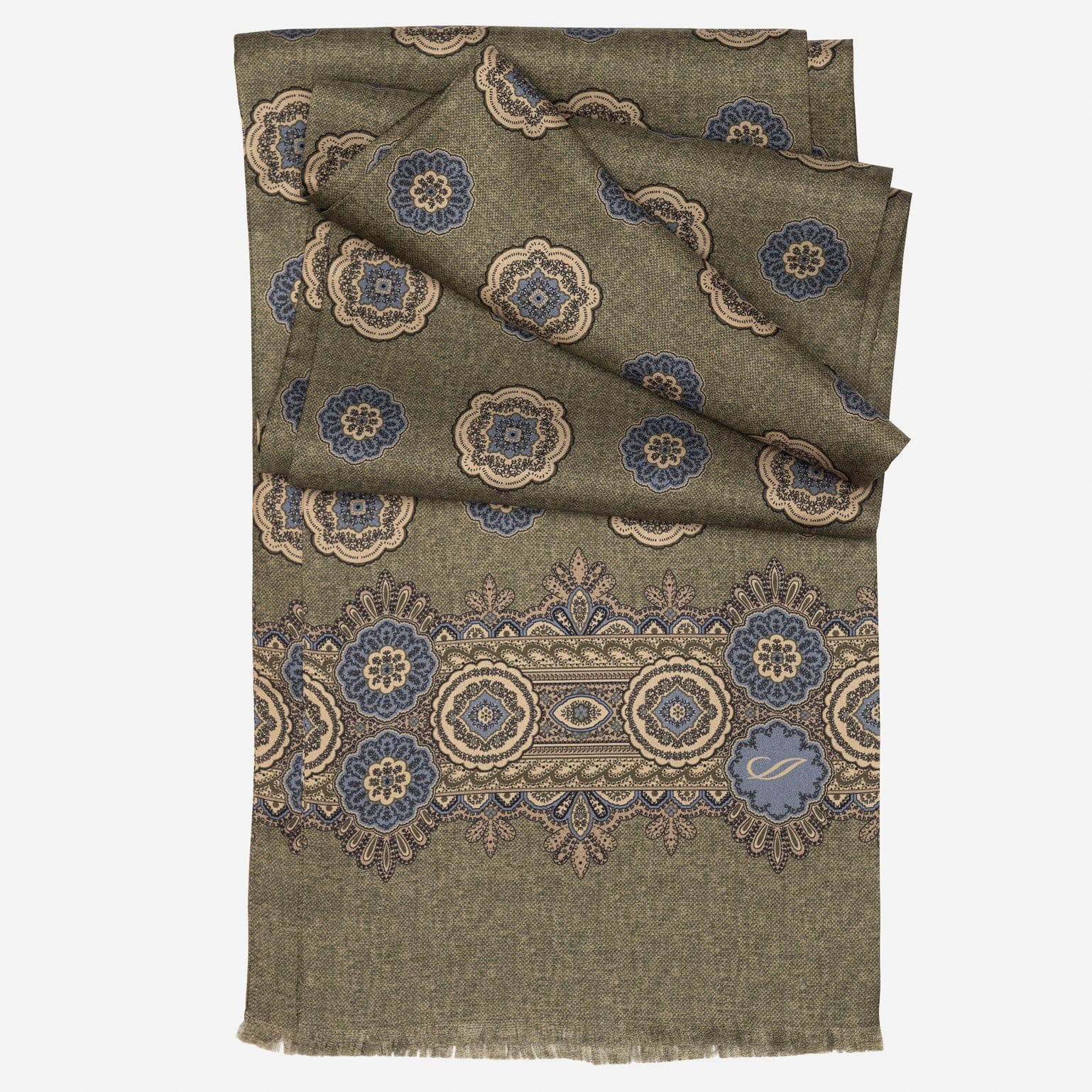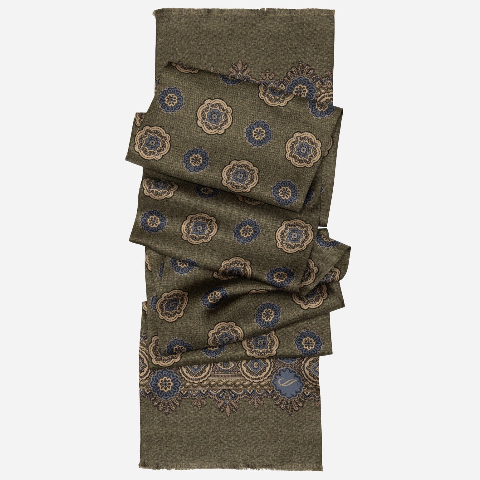The background has a textured print that adds quiet depth, while the large medallion motif brings a refined, traditional touch. The palette is sophisticated and easy to pair—whether you're wearing a suit, a wool overcoat, or jeans and a sweater.
