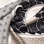 Printed on silk twill, with hand-rolled hems done the old way. The texture is smooth and luxurious, with that subtle weight silk should have.