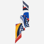 This twilly scarf features elegant geometric patterns in blue tones and red. It’s double sided which ensures a polished look however you choose to style it.