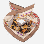This 35" square scarf is printed on silk twill, giving it a beautiful drape with just enough body to tie neatly and hold its shape.