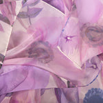 Named after the famous piazza in Rome, Campo de' Fiori (field of flowers), this sheer silk Georgette long scarf has a floral print in shades of lavender and pink with a touch of blue on ivory.