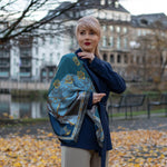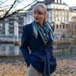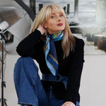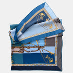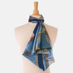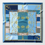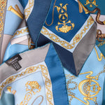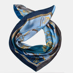 This elegant equestrian design in rich tones of navy, sky blue, petrol, and pewter is made from luxurious, buttery soft silk satin.