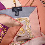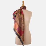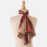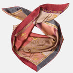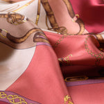 This elegant equestrian design in rich tones of reds, taupe, magenta and coral is made from luxurious, buttery soft silk satin.