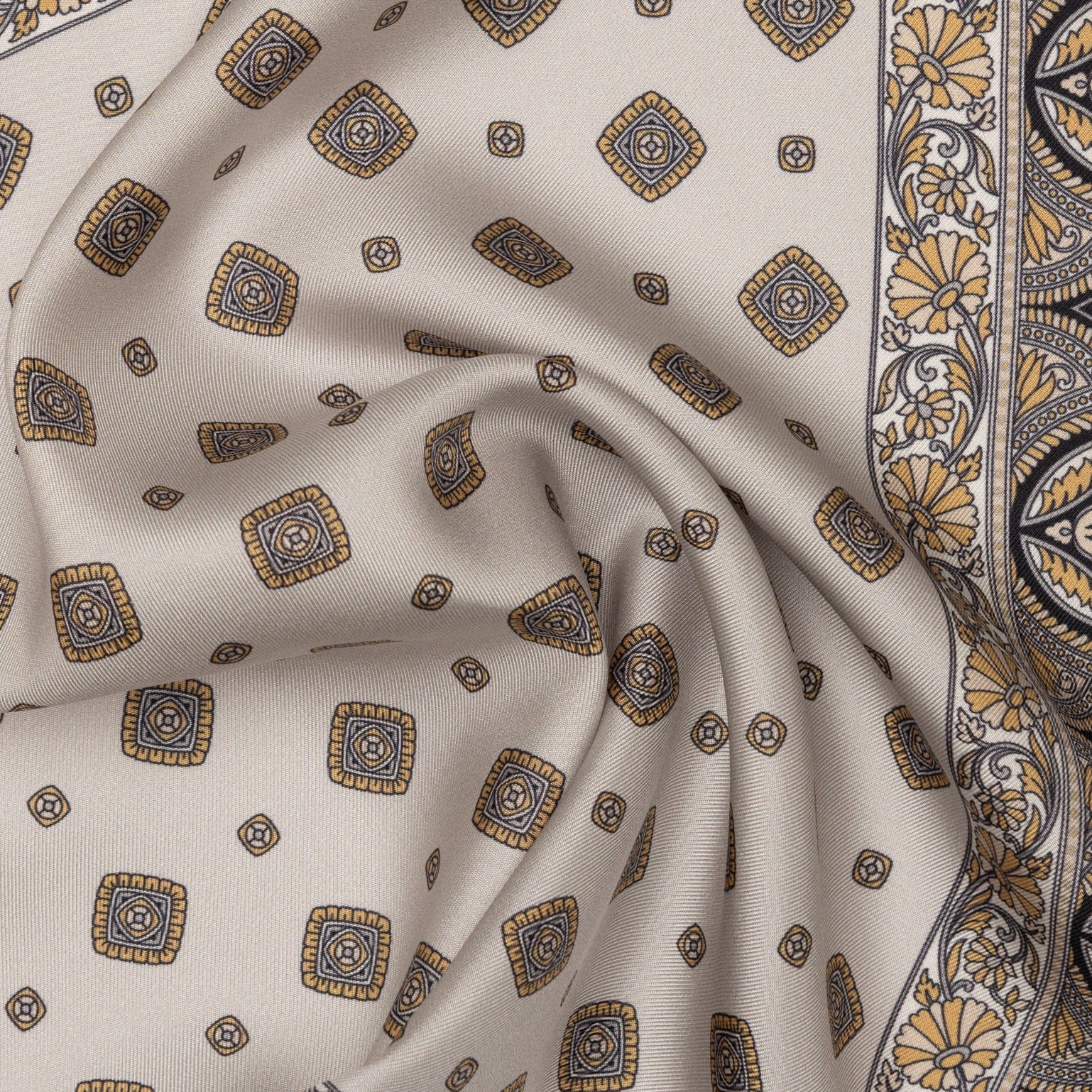 A traditional medallion print framed by a rich paisley border gives this pocket square its classic, timeless appeal.