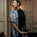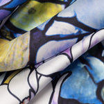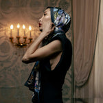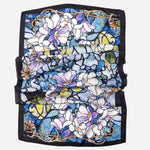 Long and lightweight, made from pure silk, the pattern inspired by the glass I’ve admired for years. You’ll see deep blues, soft greens, amber, and lavender tones woven together like a stained-glass window.