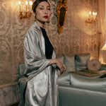 I’m thrilled to share one of our most exquisite pieces: an elegant evening shawl crafted from a rare, luxurious silk called organzino.