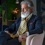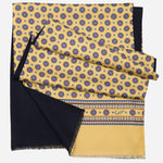 This scarf blends timeless elegance with everyday practicality. On one side, you'll find a classic medallion print on luxurious dark yellow silk twill, while the other side offers the warmth of soft ultra fine-weight dark navy wool.