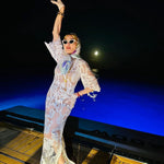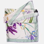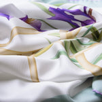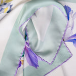 The delicate iris floral design with ribbons adds a soft, feminine touch, while the hand-rolled hems bring a bit of artisanal love to every edge.