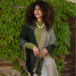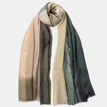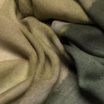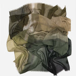 The design features paintbrush strokes in muted shades of green and olive, making it a versatile piece that works beautifully draped over your shoulders as a shawl or wrapped snugly around your neck.