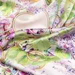 This square silk scarf showcases pink lilac blooms painted delicately by hand in watercolor, then transferred to luxurious silk.
