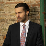 Inspired by the vibrant charm of the Sicilian city of Catania, this silk tie captures the city's essence with rich brick red and blue tones. The delicate floral print adds a touch of timeless elegance.