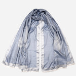The shawl features a subtle, abstract tulip pattern woven in a pale silvery blue and a sky blue - an understated yet captivating design that plays beautifully with light.