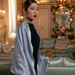 I’m thrilled to share one of our most exquisite pieces: an elegant evening shawl crafted from a rare, luxurious silk called organzino.