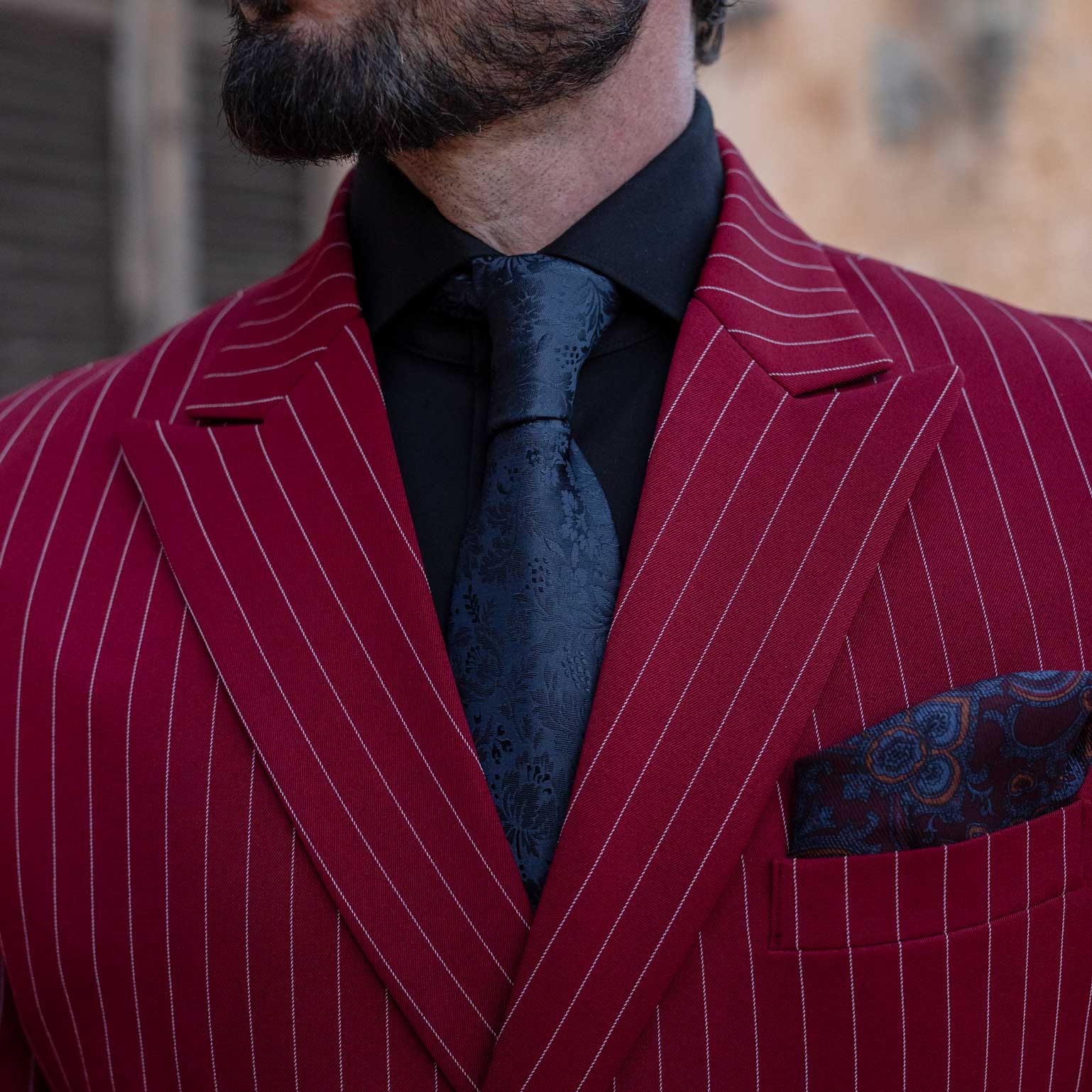 This pattern comes from a vintage floral I found in the archives, but instead of bold colors, I had it woven midnight blue-on-midnight blue. The result is a solid color silk tie with a subtle pattern you only notice when the light hits it just right.