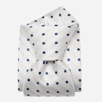 This refined design features a beautifully woven chevron pattern in white, subtly textured to catch the light. Navy blue polka dots add a touch of playful sophistication—classic yet unexpected, much like the road it’s named after.