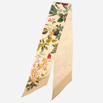 Ornella is a long, skinny silk scarf (also called a bandeau or large twilly), made in Como Italy from 100% silk twill. Tie her around your neck, wrist, bag, or hair.