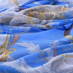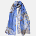 This delicate, feminine scarf features a charming equestrian print in shades of blue, perfect for adding a touch of elegance to any outfit.