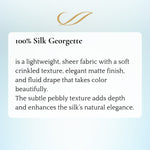 • 100% Silk Georgette: A lightweight, sheer crepe-style fabric characterized by its crinkly, pebbly texture and excellent drape that is often used in high-end fashion. It has a dull, matte finish that dyes beautifully.