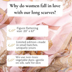 • Figure flattering size: Approx. 20” x 67” (53 x 170cm). Years of trial and error taught us that this size scarf is one of the simplest to style and makes every woman look chic.
