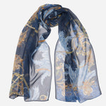 This delicate, feminine scarf features a charming equestrian print in shades of blue and tan on navy, perfect for adding a touch of elegance to any outfit.
