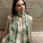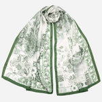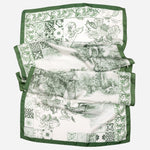 This long silk scarf features a classic Toile de Jouy motif—pastoral French scenes drawn in delicate, single-tone detail - framed by maiolica tile borders inspired by hand-painted ceramics from Southern Italy.