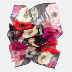 Named after the famous piazza in Rome, Campo de' Fiori (field of flowers), this sheer silk Georgette long scarf has a floral print in shades of reds and pinks with a touch of mint on black.