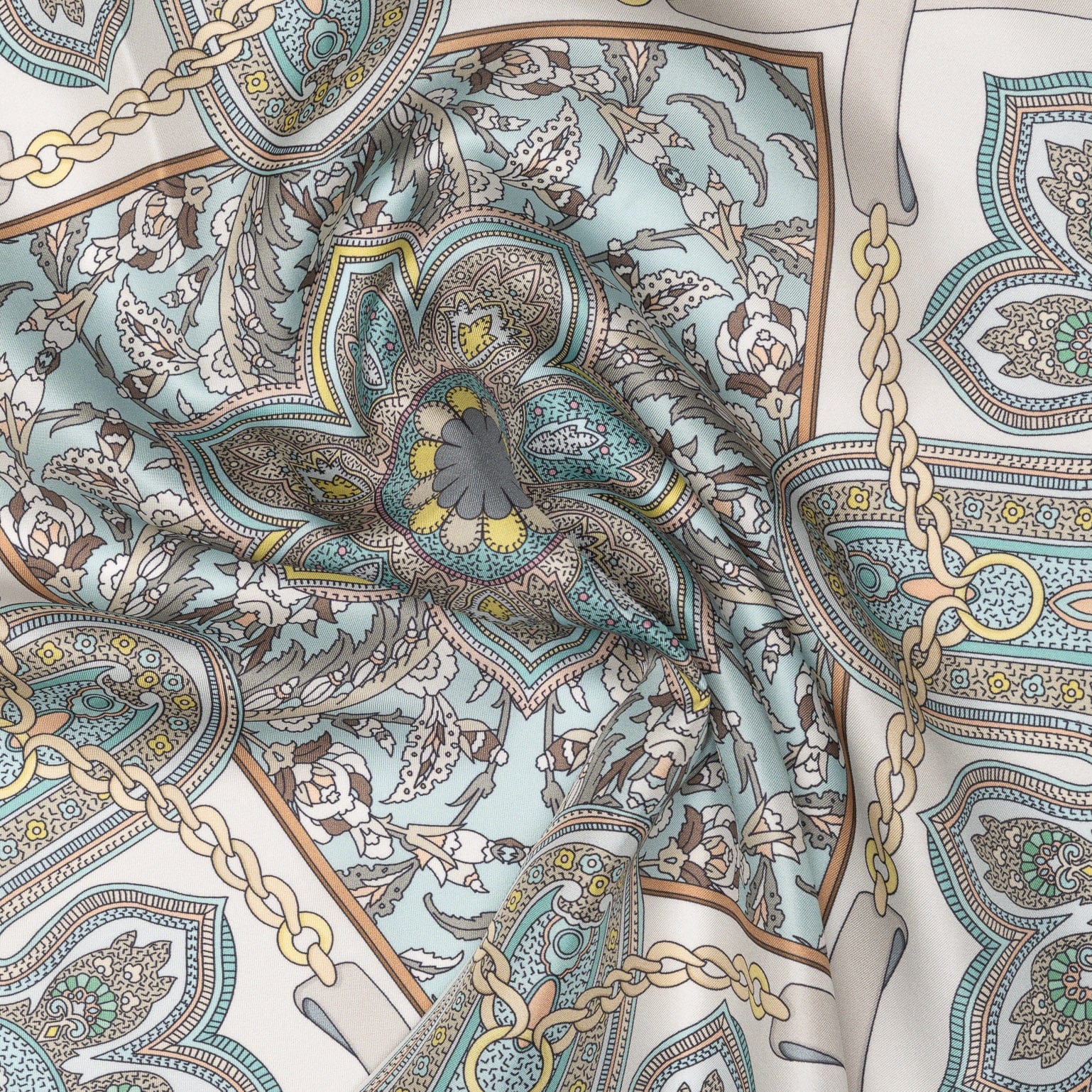 This elegant silk bandana blends a fresh take on paisley with equestrian strap detailing—classic elements reimagined in a clean, modern design.