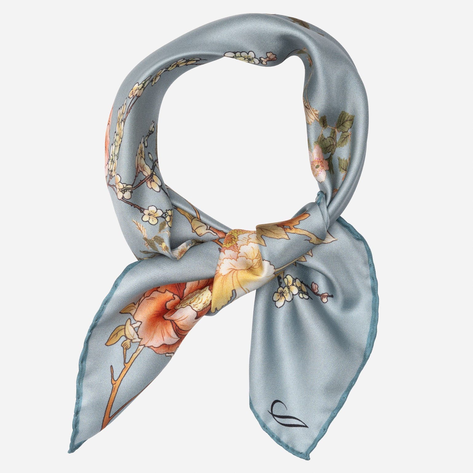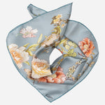 This silk bandana features a vintage-inspired floral print—delicate blooms in a palette that never goes out of style. Feminine without being fussy.