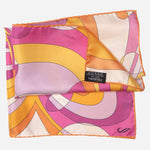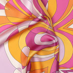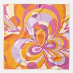 This silk twill bandana plays with shape and shadow - blocks of orange, pink, purple and yellow in a fluid geometric pattern.