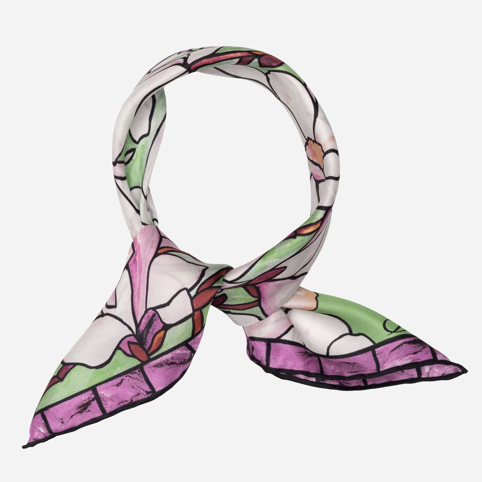 The Clara scarf is a tribute to Clara Driscoll—the artist behind many of Tiffany’s most stunning stained-glass creations. This silk bandana echoes her work: soft floral geometry, glowing tones, and that unmistakable dance of light and color.