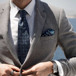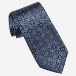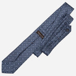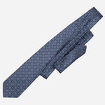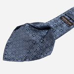 Woven in fine silk, it features a beautifully symmetrical motif—geometric yet organic, refined yet full of character. Rich navy with blue and silver grey. The intricate pattern catches the light, creating a subtle depth that feels both classic and contemporary.
